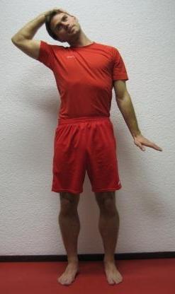 Senken Sie aktiv beide Schultern nach unten und ziehen Sie den Kopf auf eine Seite. Dabei bleibt der Blick nach vorne gerichtet. Die Dehnung wird intensiver wenn Sie – bei Dehnung der linken Seite – den linken Arm verstärkt in Richtung Boden ziehen und zusätzlich mit der freien Hand die Neigung des Kopfes unterstützen. Die rechte Seite wird dementsprechend spiegelverkehrt ausgeführt. Die Übung können Sie stehend, sitzend oder kniend durchführen.