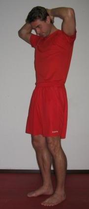 Umfassen Sie den Kopf mit beiden Händen und ziehen Sie das Kinn möglich nah an die Brust heran. Senken Sie dabei beide Schultern bewusst nach unten.