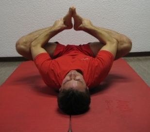 Auf dem Rücken liegend fassen Sie beide Fußgelenke und drehen die Oberschenkel im Hüftgelenk nach außen. Drücken Sie nun mit dem Ellbogen gegen die Innenseite der Knie und verstärken Sie behutsam die Dehnung.