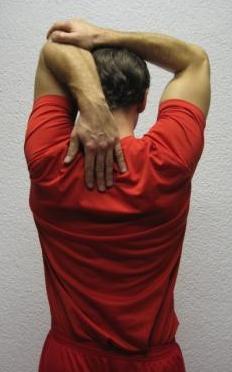 Heben Sie einen Arm und legen Sie die Hand hinter dem Kopf auf der Gegenschulter oder der Halswirbelsäule ab, indem Sie das Ellbogengelenk maximal beugen. Mit der freien Hand fassen Sie den Ellbogen und verstärken durch Zug die Dehnung.