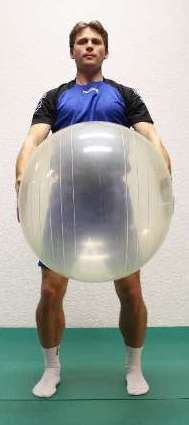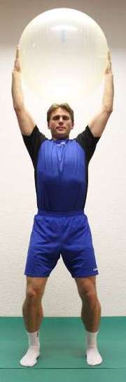 Der Ball wird in die Hände genommen und zusammengepresst. Festen Stand des Körpers halten und nun langsam ohne Schwung den Ball nach oben führen. Anschließend den Ball nach rechts und nach links bewegen und den Körper strecken.