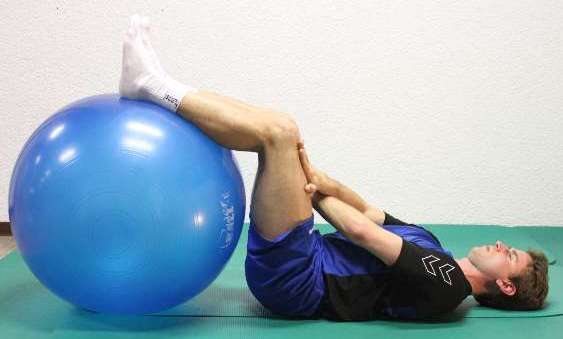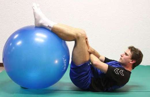 In Rückenlage liegend auf einer Matte, die Beine sind auf dem Großen Ball.Der Kopf kann auf dem Boden liegen bleiben oder angehoben werden. Die Arme werden gekreuzt auf die Oberschenkel gelegt. Nun mit aller Kraft gegen die Oberschenkel drücken und die gesamte Bauchmuskulatur trainieren.